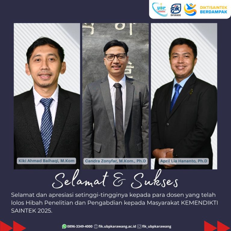 Fakultas Ilmu Komputer Universitas Buana Perjuangan Karawang dengan bangga menyampaikan ucapan Selamat dan Sukses kepada para dosen yang telah berhasil lolos seleksi Hibah Penelitian dan Pengabdian kepada Masyarakat Tahun Anggaran 2025 yang diselenggarakan oleh Kementerian Pendidikan Tinggi, Sains, dan Teknologi.